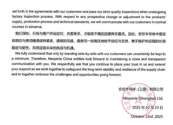 【大河财立方消息】10月23日午间,安世半导体中国公司发布致客户一封信,其中提到配资首选门户网站,目前,安世半导体中国实体各项生产经营正有序推进,董事会、管理层及全体员工正尽最大努力致力于保障广大客户供应链稳定。公司始终将客户利益置于首位,将保障客户生产连续性视为现阶段最高追求。