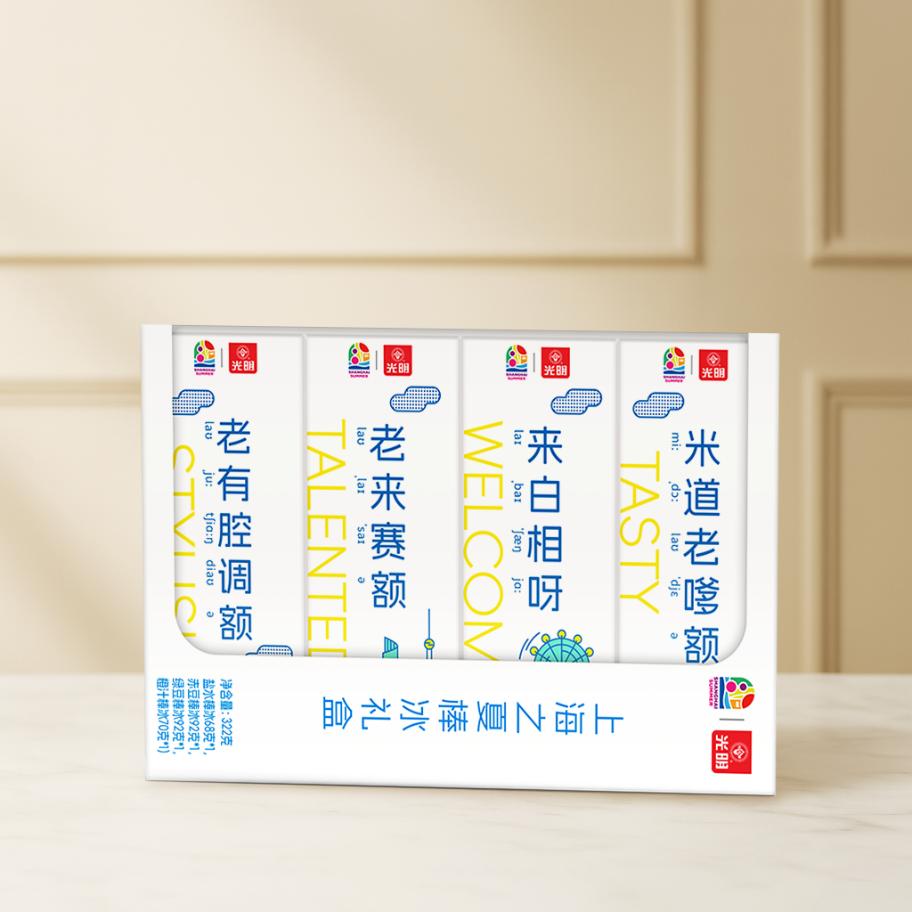礼盒精选盐水、赤豆、绿豆及橙汁四款经典棒冰,每一款都是上海小囡们心中的“夏日符号”。光明盐水棒冰咸中回甘,一口便能勾起童年午后蒲扇轻摇的惬意;赤豆棒冰以绵密豆沙包裹细碎冰晶,还原食材本味;绿豆棒冰清新沁爽,是弄堂嬉戏后的清凉标配;橙汁棒冰则含17%果汁成分,酸甜口感迸发元气活力。这些熟悉的味道,早已深深融入上海的城市基因,成为几代上海人的共同记忆。